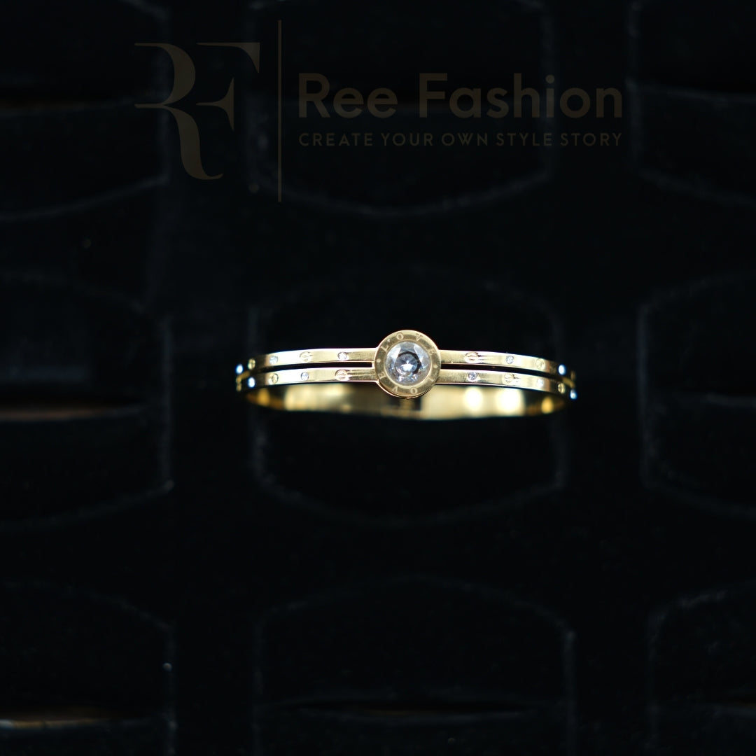 The Golden Aura Charm Bracelet is a stunning blend of luxury, elegance, and modern sophistication. Crafted in a radiant gold-tone finish, this bracelet features a beautifully polished band accented with evenly placed micro-studs, adding a subtle yet glamorous sparkle. At its center rests a striking circular charm embedded with a dazzling crystal, designed to catch the light from every angle. The charm is engraved with delicate lettering, enhancing its refined and premium appeal.