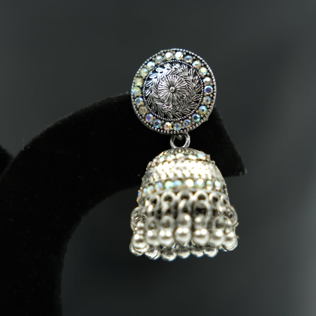 The dome-shaped jhumka is adorned with precisely cut mirror accents and detailed filigree work that showcases true artisanal skill. The silver-tone finish adds a modern, regal charm while retaining the classic essence of traditional jhumkas. The lower fringe features delicate loops that sway gracefully with every movement, adding a soft rhythm and completing the enchanting design.