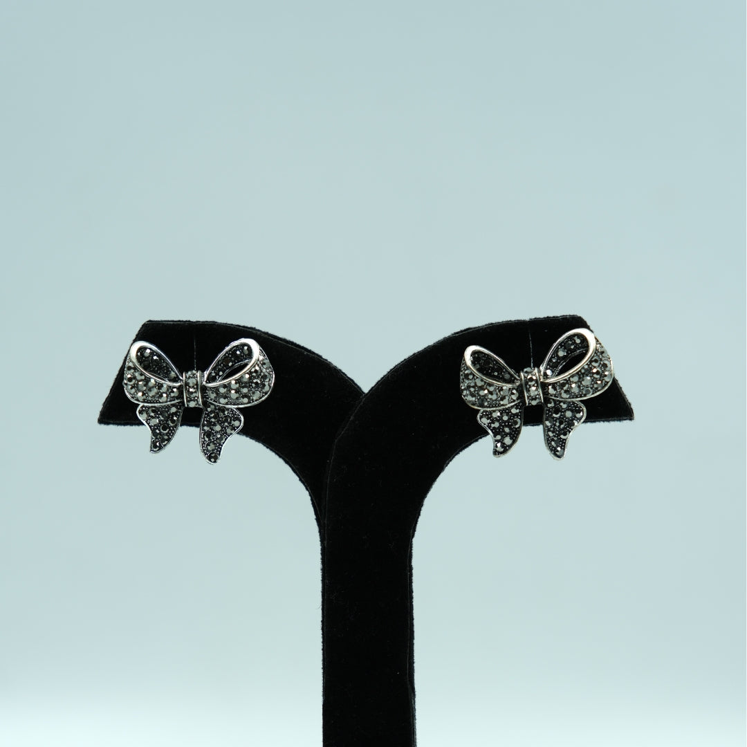 Midnight Bow Spark Studs are a graceful blend of charm, elegance, and contemporary glamour. Designed in a delicate bow shape, these earrings symbolize femininity, celebration, and refined beauty. Crafted with a silver-toned base and adorned with shimmering black and smoky crystal stones, they create a captivating contrast that instantly draws attention. The intricate pavé detailing across each curve of the bow reflects light beautifully, giving these studs a subtle yet luxurious sparkle.