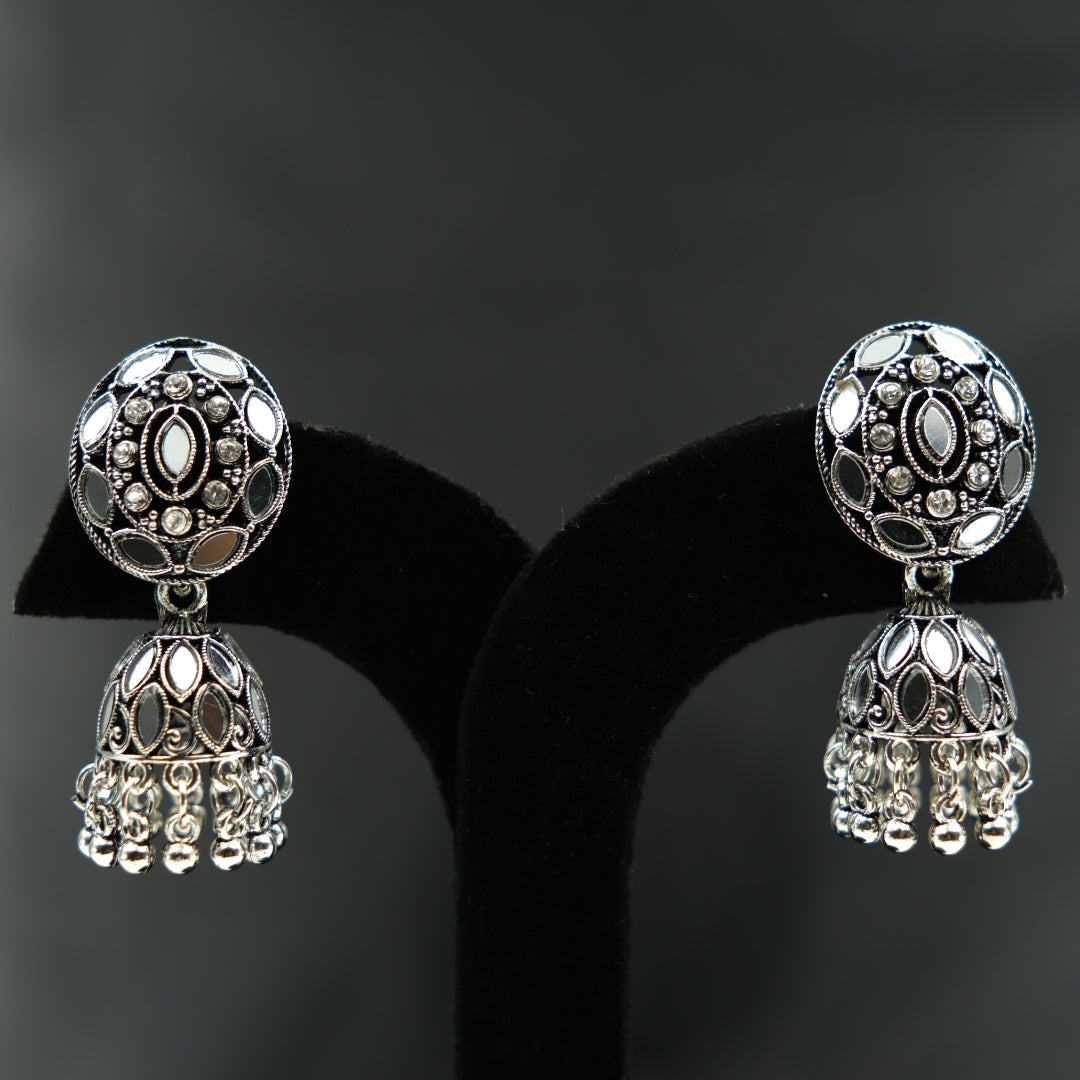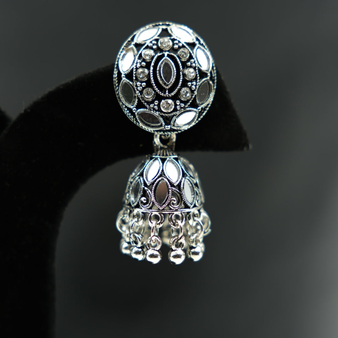 The Royal MirrorMeenakari Dome Jhumka Earrings are a striking blend of traditional artistry and contemporary silver elegance. These earrings feature a beautifully crafted circular stud adorned with intricate mirror work and detailed metal embossing, creating a radiant, eye-catching design. The reflective patterns on the stud add depth and sparkle, making these earrings an elegant statement piece for any festive or traditional ensemble.