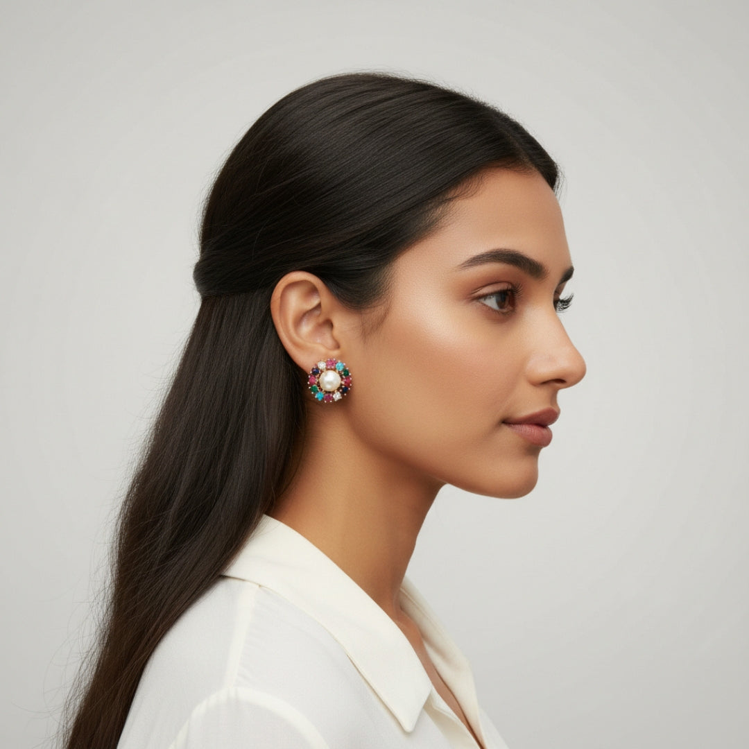 The Navratna Pearl Radiance Set is a graceful blend of tradition, symbolism, and contemporary elegance. Inspired by the timeless beauty of Indian heritage jewelry, this exquisite set features a luminous central pearl surrounded by vibrant Navratna stones, each carefully placed to create a harmonious circular design. The multicolored gemstones—representing the nine celestial stones—add a rich cultural essence while enhancing the visual appeal with their vivid hues.