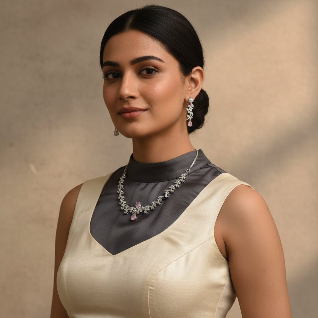Versatile and stylish, the Blush Crystal Vine Necklace Set complements pastel shades, neutral tones, and richly colored outfits alike. Whether styled with an elegant gown, ethnic wear, or fusion attire, it enhances your overall look with understated sophistication. The secure clasps and premium finish ensure durability and long-lasting brilliance.