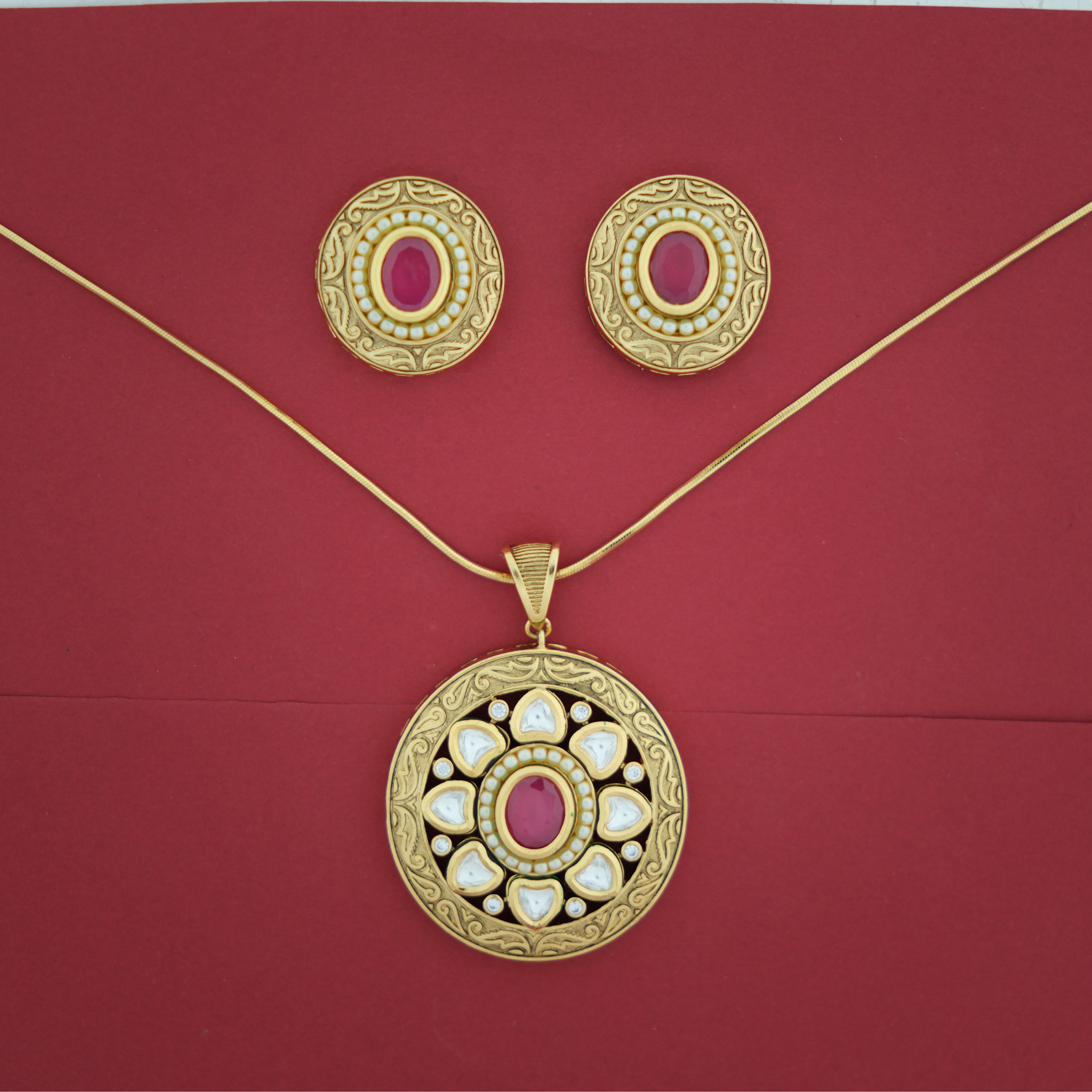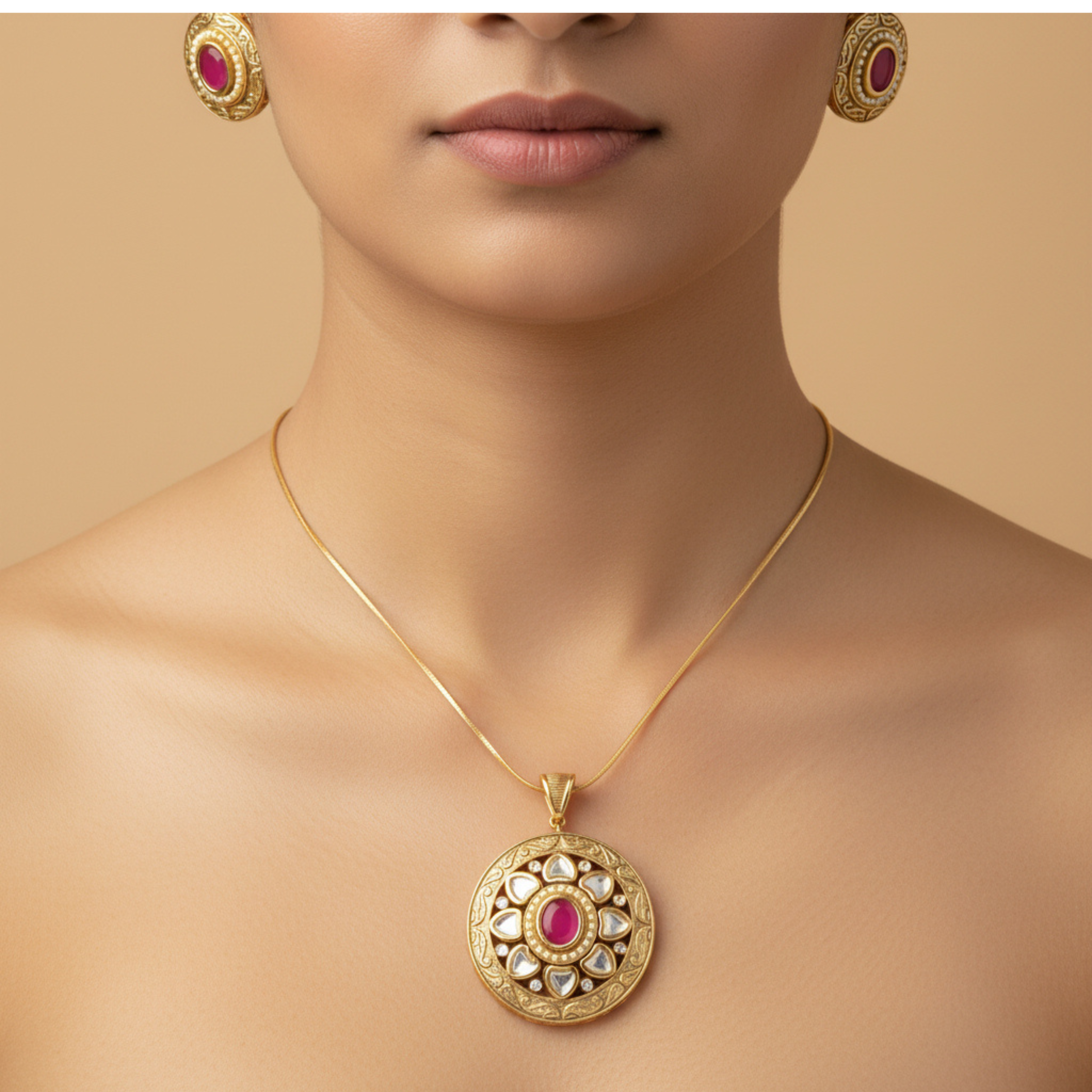 The pendant showcases intricate engraved patterns along its border, highlighting fine artistry and attention to detail. Suspended from a sleek gold chain, it rests gracefully at the neckline, enhancing the wearer’s natural elegance. The matching round stud earrings mirror the pendant’s regal design, creating a perfectly coordinated and sophisticated look.
