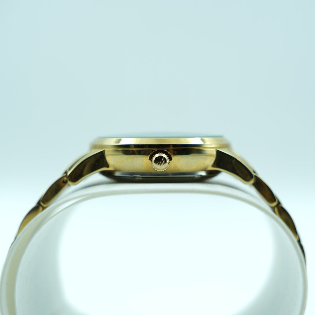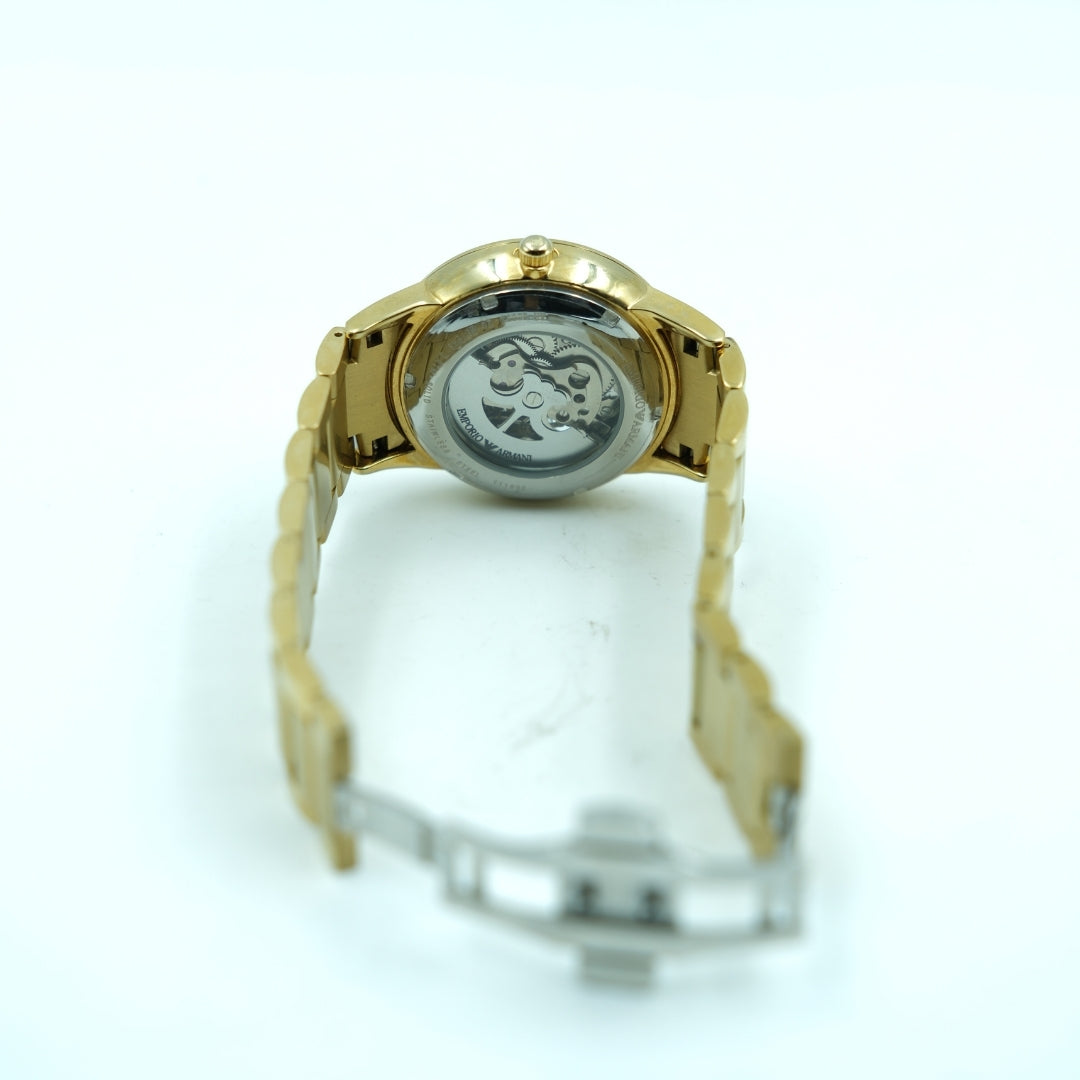 The watch is encased in a bold gold-toned stainless-steel body, paired with a matching bracelet that enhances its premium presence. Its minimalist hour markers and sleek gold hands add refinement while ensuring clear readability. Designed for modern elegance, the Gold Skeleton Automatic seamlessly blends traditional watchmaking with contemporary aesthetics.