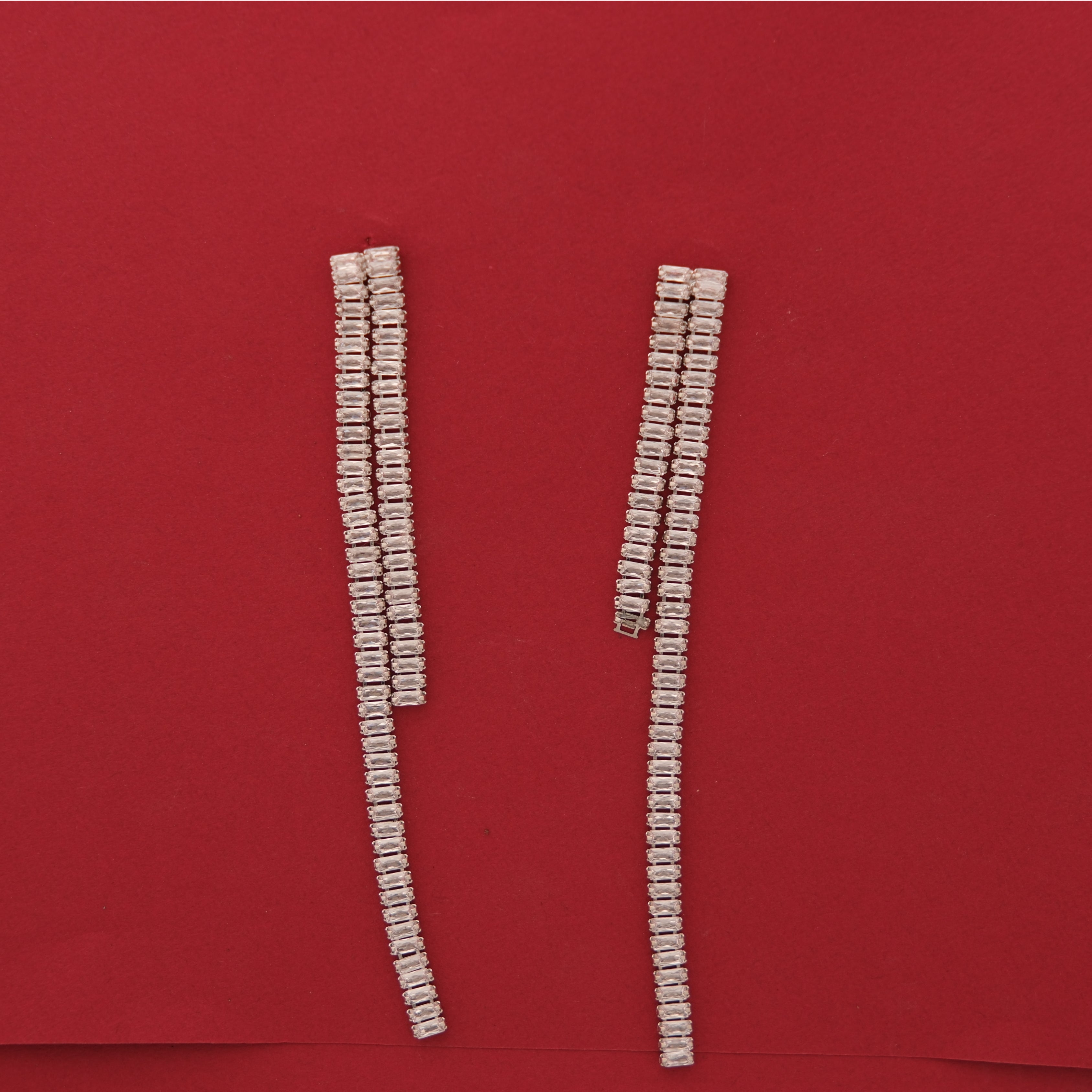 Inspired by contemporary fine jewelry aesthetics, Eterna Spark Line Earrings are ideal for formal occasions, weddings, receptions, and elegant evening events. The uniform sparkle of the stones reflects light beautifully, creating a radiant shimmer that enhances your look from every angle. Whether paired with a classic saree, an evening gown, or a tailored western outfit, these earrings add effortless sophistication.