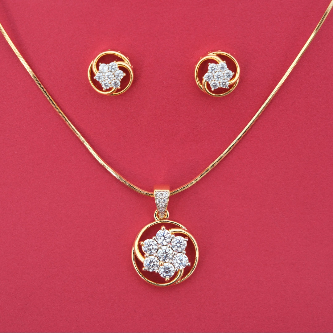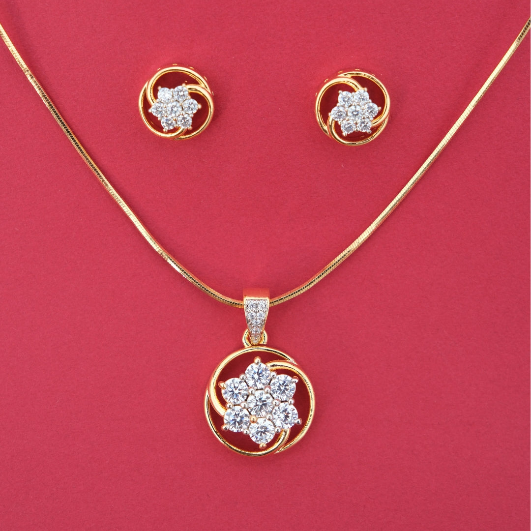 Encircling the floral centerpiece is a smooth, swirling gold-toned frame that adds a sense of movement and modern artistry to the design. The polished gold finish enhances the brilliance of the stones, creating a perfect balance between classic luxury and contemporary style. The pendant is suspended from a sleek, elegant chain that rests comfortably on the neckline, making it suitable for both daily elegance and special occasions. The matching earrings echo the pendant’s design, offering a cohesive and refined look.