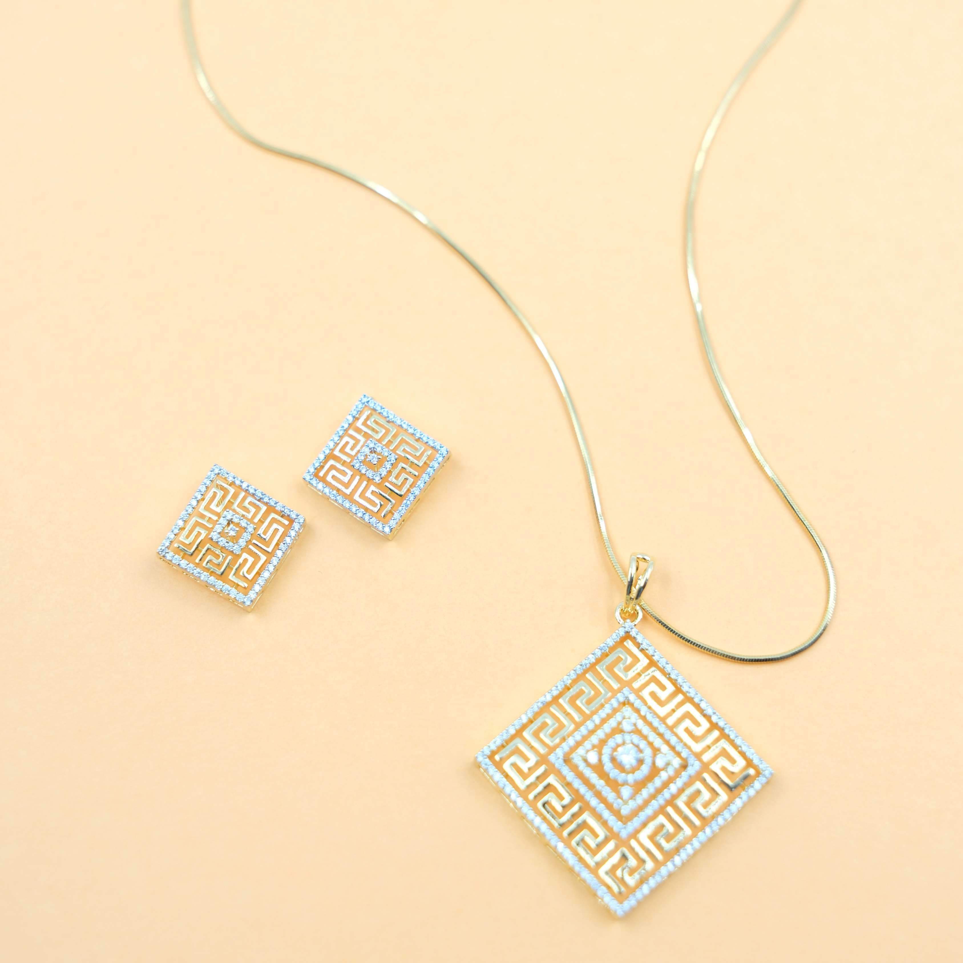 Suspended from a sleek gold-tone chain, the pendant rests gracefully at the center of the neckline, drawing attention without overwhelming the look. The finely detailed pattern reflects light from every angle, adding depth and brilliance to the design. Complementing the pendant, the matching square stud earrings echo the same geometric motif, creating a cohesive and refined appearance.