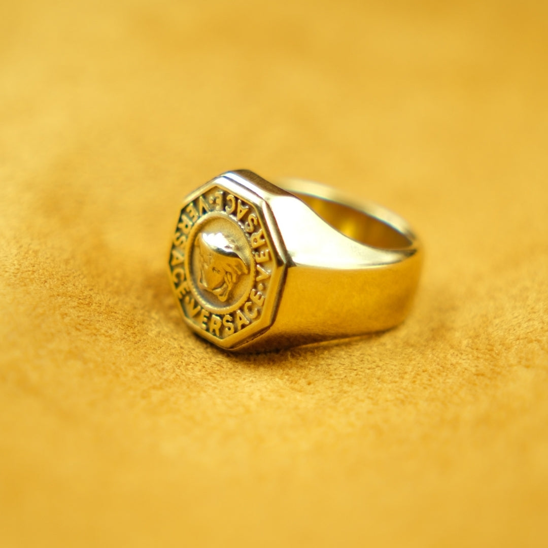 The Imperial Caesar Emblem Gold Signet Ring is a bold and timeless statement piece crafted for those who appreciate heritage-inspired luxury. This striking ring features an octagonal face adorned with a classical profile emblem at its center, surrounded by engraved text that enhances its regal and historic appeal. The polished gold-tone finish adds a rich, luminous glow, making the ring stand out effortlessly on any hand.