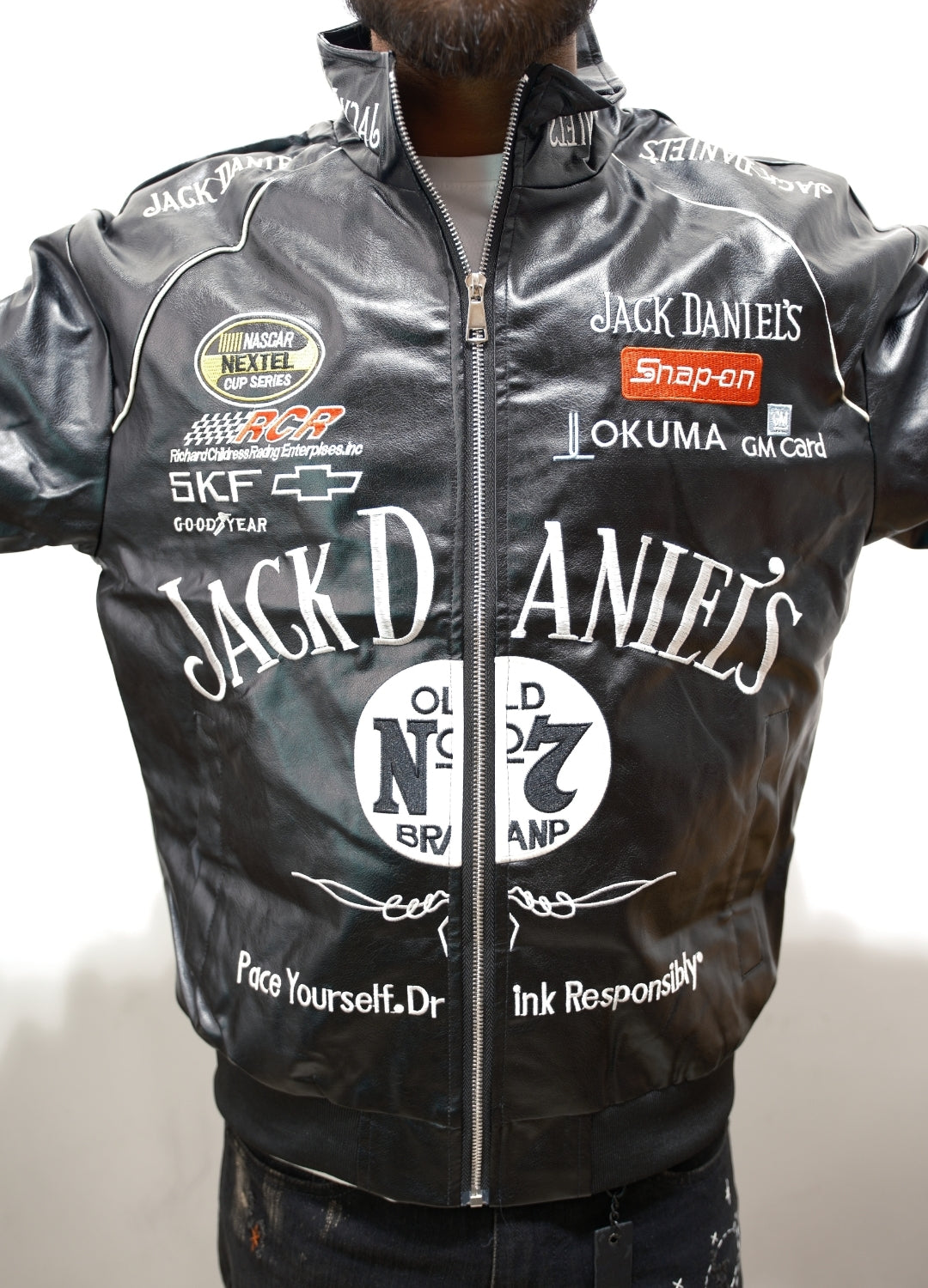 Make a bold statement with this Jack Daniel’s Racing Leather Jacket, designed for fans of iconic branding, motorsport culture, and premium streetwear. This jacket features a striking black leather finish embellished with detailed embroidered patches, including Jack Daniel’s Old No. 7, NASCAR Nextel Cup Series, RCR, Snap-on, Goodyear, and more—bringing together classic whiskey heritage and high-octane racing energy.