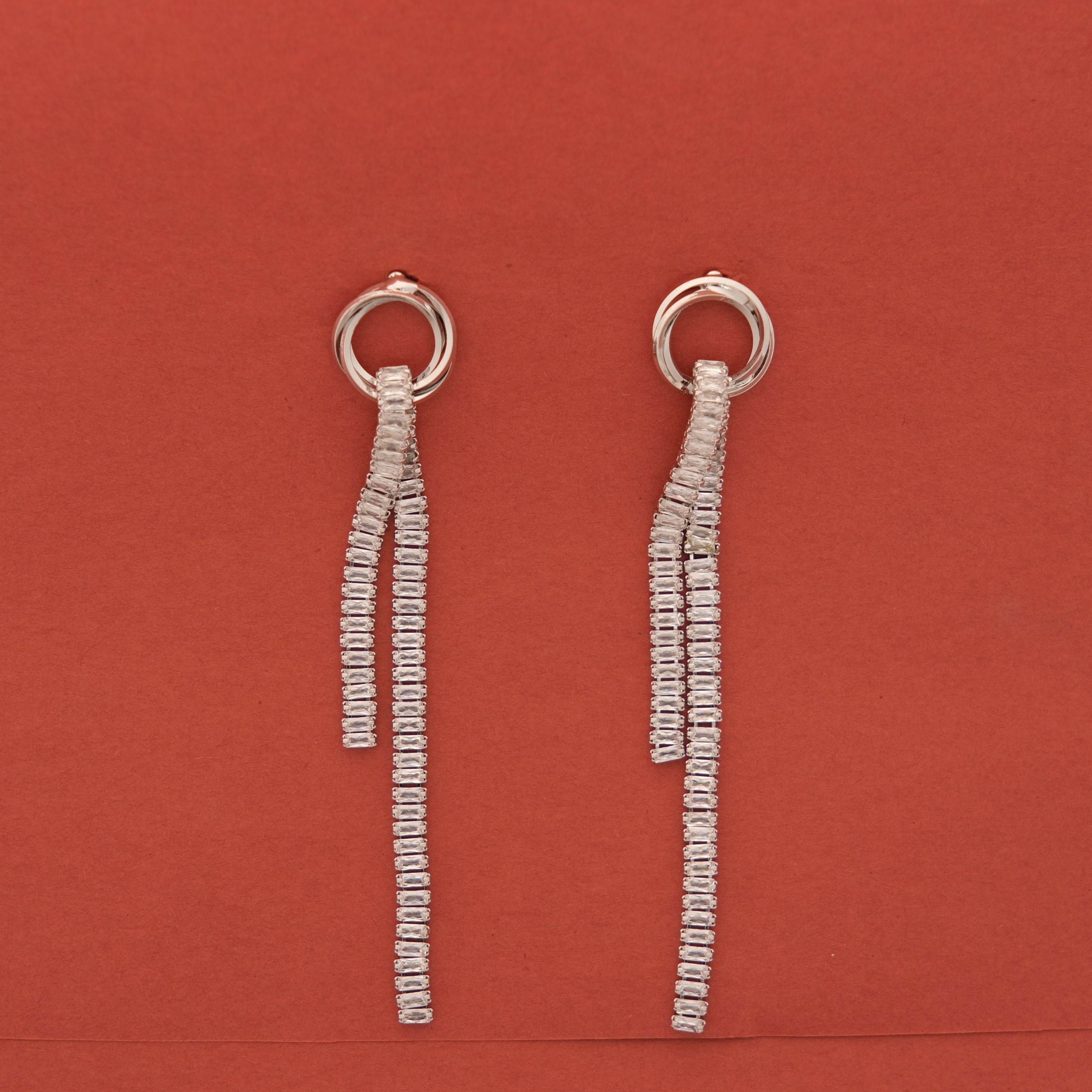 Silver Cascade Loop Earrings are a stunning expression of modern elegance and refined sparkle. Designed with sleek circular tops, these earrings flow into delicate, crystal-studded strands that create a graceful cascading effect. The clean silver-tone finish paired with shimmering stones gives them a contemporary yet timeless appeal, making them a versatile choice for both formal and stylish evening looks.
