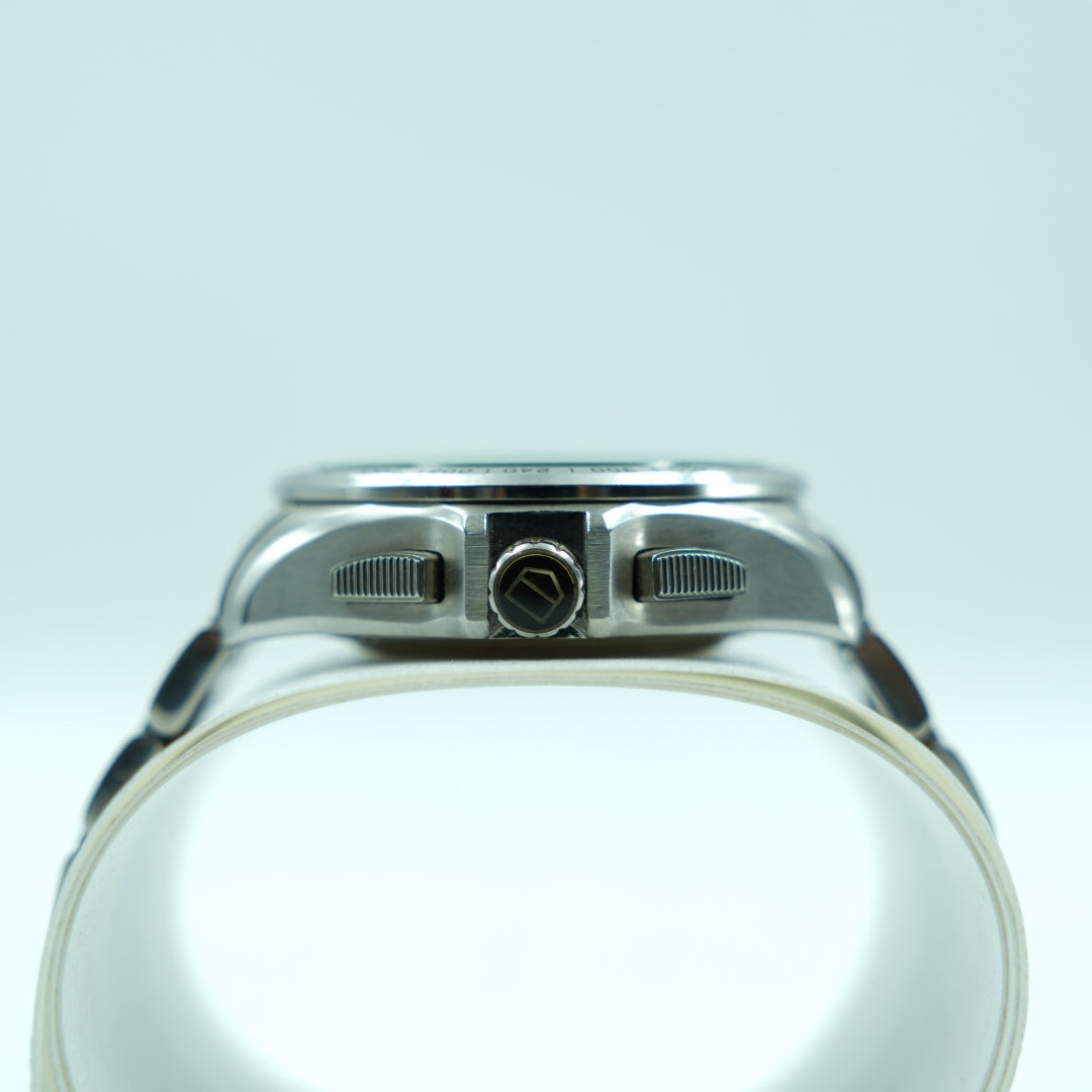 The luminous hour markers and bold hands ensure clear readability, complemented by detailed time-tracking features designed for accuracy and convenience. Its chronograph functions allow precise measurement of seconds, minutes, and speed—perfect for men who value performance-driven accessories. The side pushers and crown are crafted with attention to detail to ensure comfortable handling and long-term reliability.