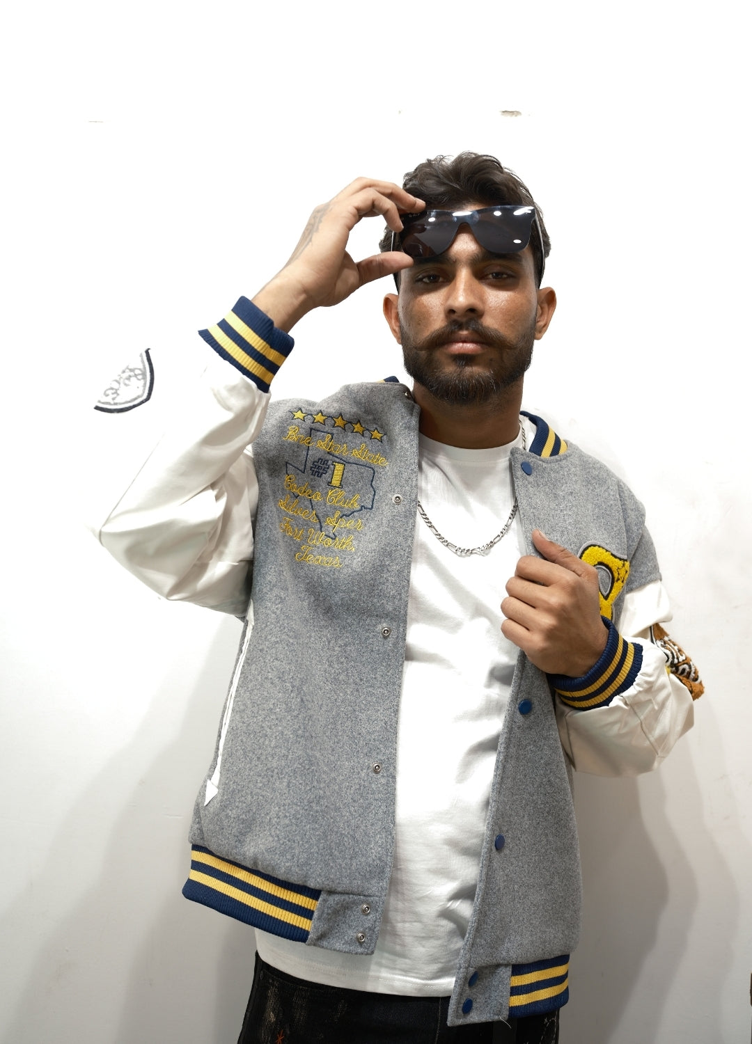 On the front, the embroidery reads “One Star State, Rodeo Club, Silver Spur, Fort Worth, Texas,” giving the jacket a heritage-inspired aesthetic. The striped ribbed collar, cuffs, and hem in blue and yellow add a sporty varsity touch, while the snap-button closure provides convenience and a clean finish.