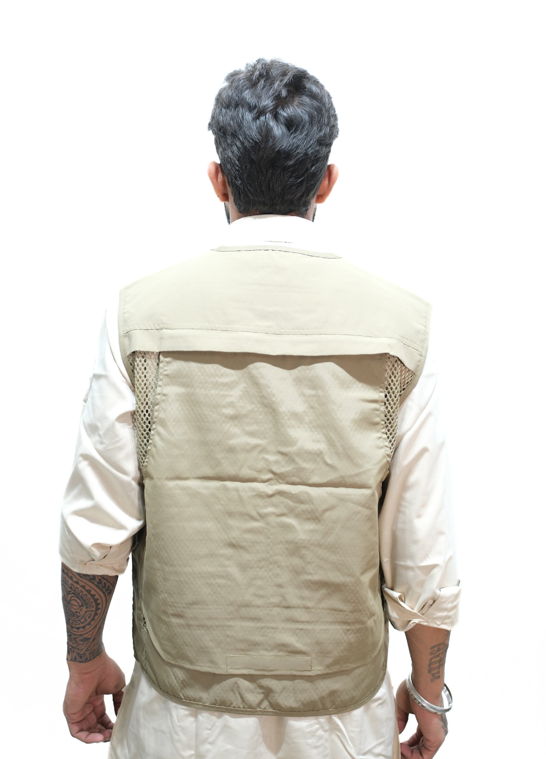 The neutral desert-tan color adds a modern, versatile touch that pairs effortlessly with tees, kurtas, cargo pants, and joggers, allowing you to style it for both streetwear and utility-focused outfits. The front zip closure ensures quick access and a comfortable, secure fit. Designed with attention to detail, the vest blends practicality with sharp aesthetics, making it perfect for travel shoots, outdoor adventures, or elevating your fashion statement.